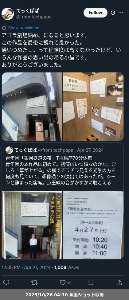 | 日時場所 | 2024/04/25(木)~2024/04/29(月) こまばアゴラ劇場(東京都) |