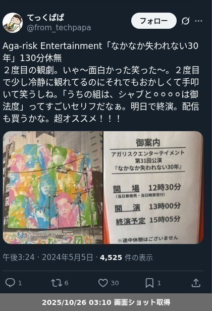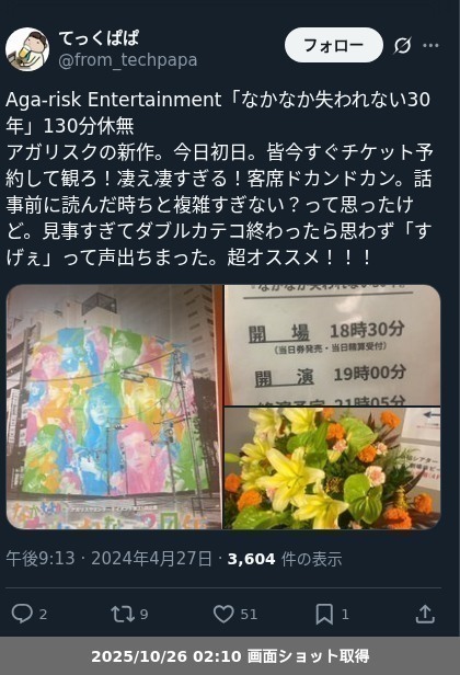 【ネタバレ分離】 Aga-risk Entertainment「なかなか失われない30年」の観劇メモです。