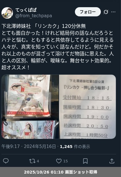 【ネタバレ分離】 下北澤姉妹社 「リンカク」の観劇メモです。