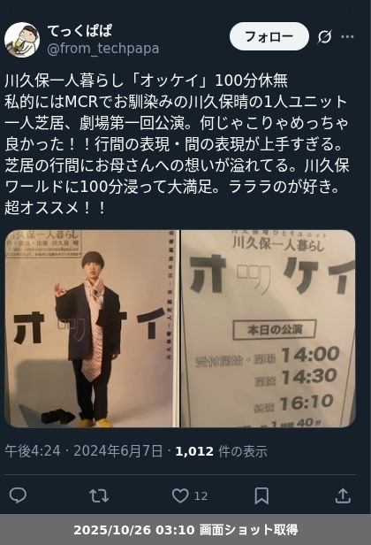 【ネタバレ分離】 川久保一人暮らし「オッケイ」の観劇メモです。