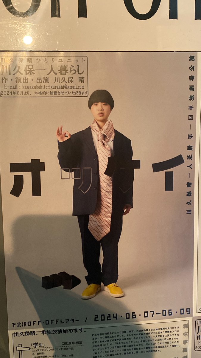 約6年前に突然思い立って以降、東京、大阪含めさまざまな土地に場所を見つけては身一つで飛び込むなどして、そしてそれぞれの場所で主に若さと愛嬌を入口に信じられないほどの愛や次の場所をいただくなどして、一人芝居を上演してきた川久保晴(28)が、「学生ではなくなった」を寂しがっている間に若いひとでも無くなってきている自身の年齢に直面しながら、だからというわけではないけれどずっと自分のノートには当たり前にあった劇場での単独公演という段階に、気持ちとしては満を持して踏み切る、第一回目の公演です。