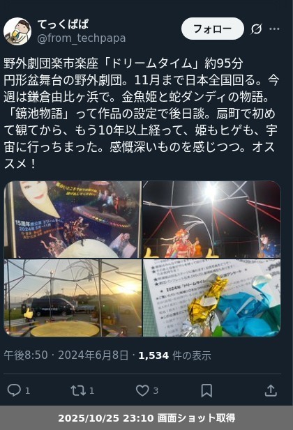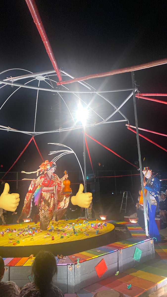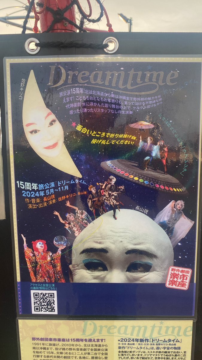 円形盆舞台の野外劇団。11月まで日本全国回る。今週は鎌倉由比ヶ浜で。金魚姫と蛇ダンディの物語。「鏡池物語」って作品の設定で後日談。扇町で初めて観てから、もう10年以上経って、姫もヒゲも、宇宙に行っちまった。感慨深いものを感じつつ。オススメ!