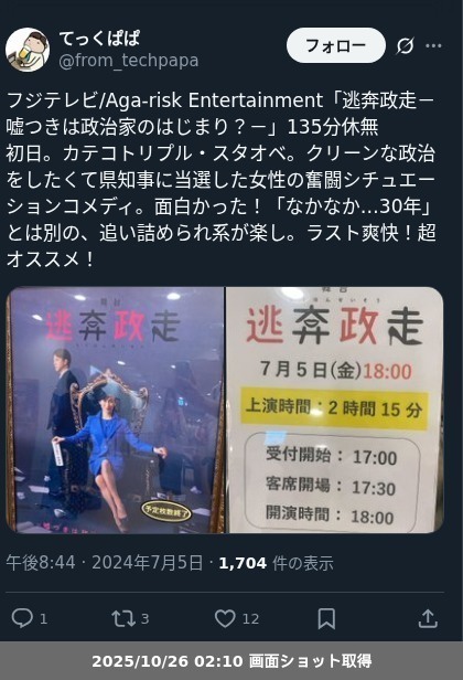 【観劇メモ】フジテレビジョン/Aga-risk Entertainment「逃奔政走」