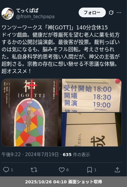 ドイツ戯曲。健康だが尊厳死を望む老人に薬を処方するかの公開討論演劇。最後客が投票。裁判っぽいのは気になるも、脳みそフル回転。考えさせられた。私自身科学的思考強い人間だが、神父の主張が超刺さる。宗教の存在に想い馳せる不思議な体験。超オススメ!