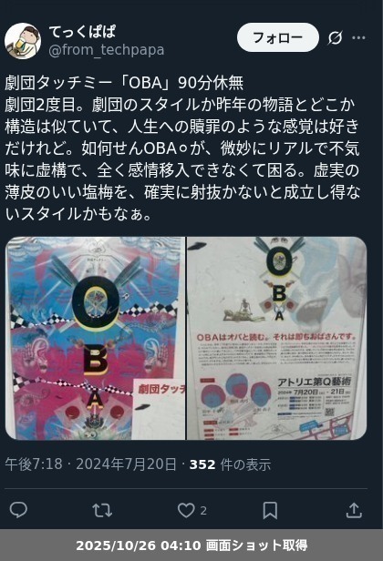 【ネタバレ分離】 劇団タッチミー「OBA」の観劇メモです。