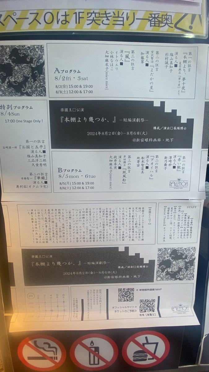 ……と、長々と書いてきたが、今回の公演は、楽園王が今も昔も面白いと思っている、そんな演出作品をたくさん上演する機会になる。大げさではなく、過去の好評作や自信作、ここでしか観られない短編が並ぶ公演だ。初めて使う劇場になる新宿の眼科画廊の地下、小劇場の秀作が次々と発表される会場だから緊張感もある。タイニイアリスが閉館してから新宿に出られてなかったが、やっぱり新宿での公演が嬉しい。