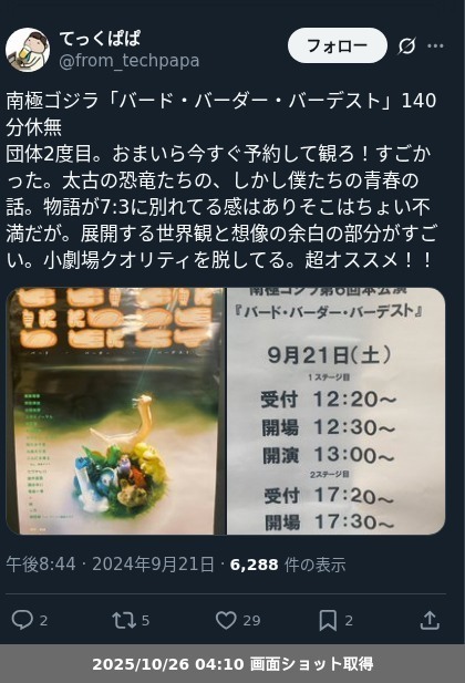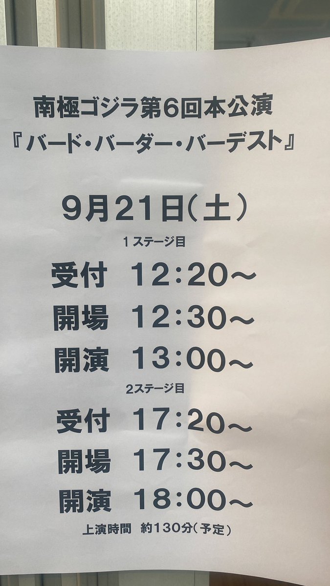 【ネタバレ分離】 南極ゴジラ「バード・バーダー・バーデスト」の観劇メモです。