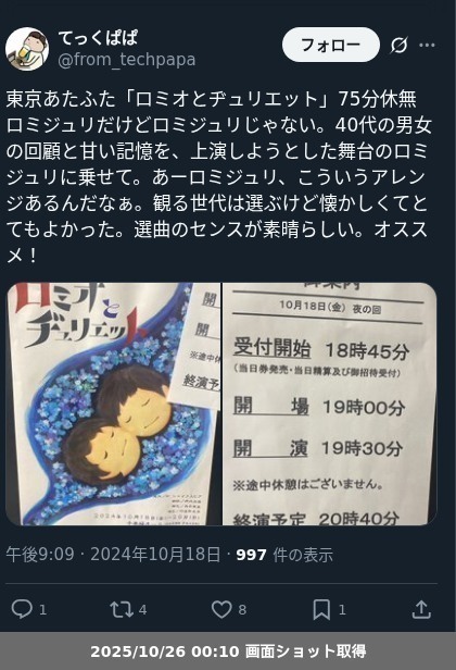 【ネタバレ分離】 東京あたふた「ロミオとヂュリエット」の観劇メモです。