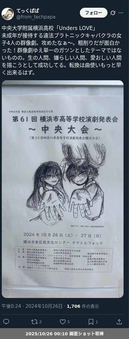 | 2 | 中央大学附属横浜高等学校 | Unders LOVE | 作:安田桜子 〇 | 10/26 11:20- |