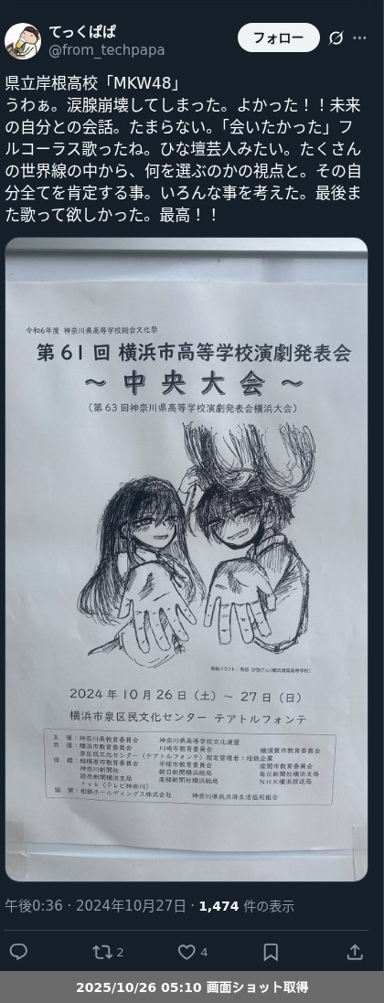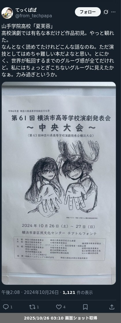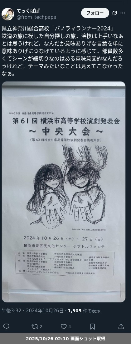 | 4 | 県立神奈川総合高等学校 | パノラマランナー2024 | 作・翻案:古谷泰三 〇 | 10/26 14:30- |