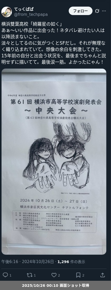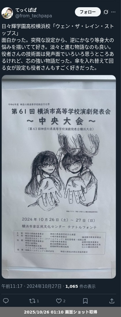 - 2025年10月25日 第62回 横浜市高等学校演劇発表会(高校演劇 神奈川県横浜市 中央大会)
