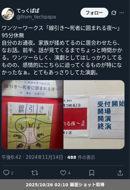 【ネタバレ分離】 ワンツーワークス「線引き~死者に囲まれる夜~」の観劇メモです。