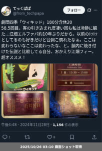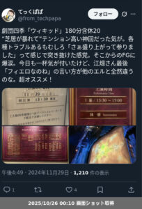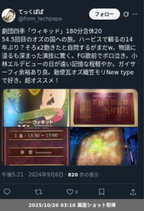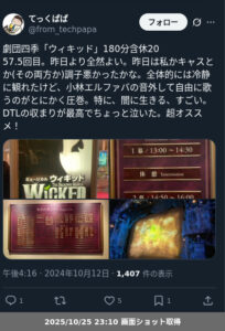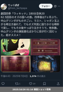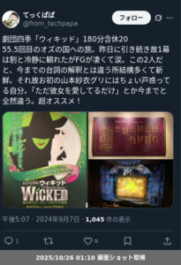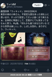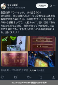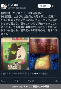 作品63.5回目にして、今回の一連の公演のMy楽。次はいつ観れるかは分からない。おそらく次に見るころには、映画の後編(Wicked: For Good)を見た後になるだろう。映画に引きずられて、舞台の観方も、いろいろと見方が変わってしまうであろうことは必須だろう。この感情をしっかり保ちながら、次の「ウィキッド」の舞台公演を待つ。