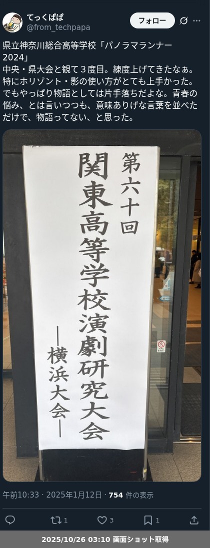 | 1 | 県立神奈川総合高等学校 | パノラマランナー2024 | 古谷泰三/作・翻案〇 | 1/12 9:30- |