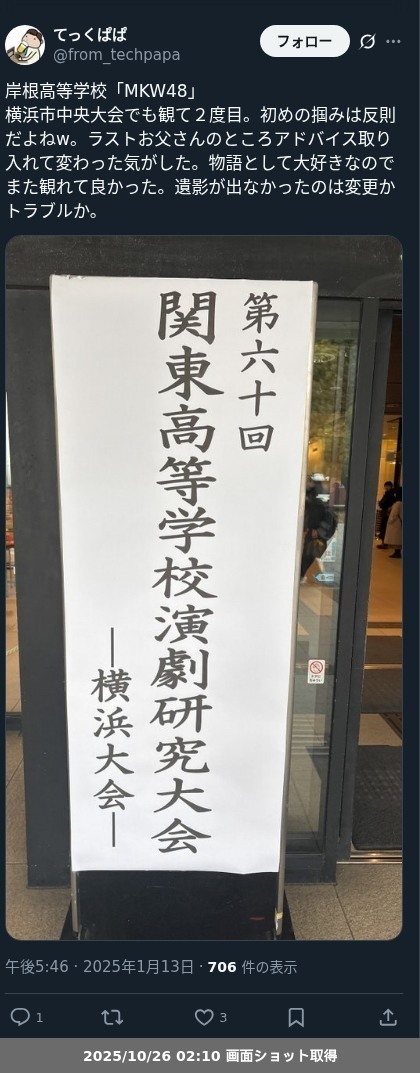 | 13 | 県立岸根高等学校 | MKW48 | 菊本亘孝と岸根高校演劇部/作〇 | 1/13 16:40- |