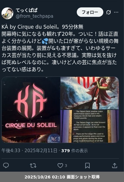 【ネタバレ分離】Cirque du Soleil「KÀ」の観劇メモです。