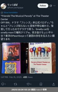 セットは日本の小劇場のようだが、ミュージカルとしては出演者の歌唱のレベルも高くて楽しい。楽しいミュージカルなのだが…あまりの「フレンズ」に忠実なネタの「細かさ」に、ちょっとビックリする。