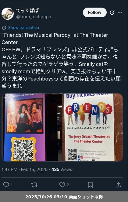 【ネタバレ分離】The Jerry Orbac Theater「Friends! The Musical Parody」の観劇レポートです。
