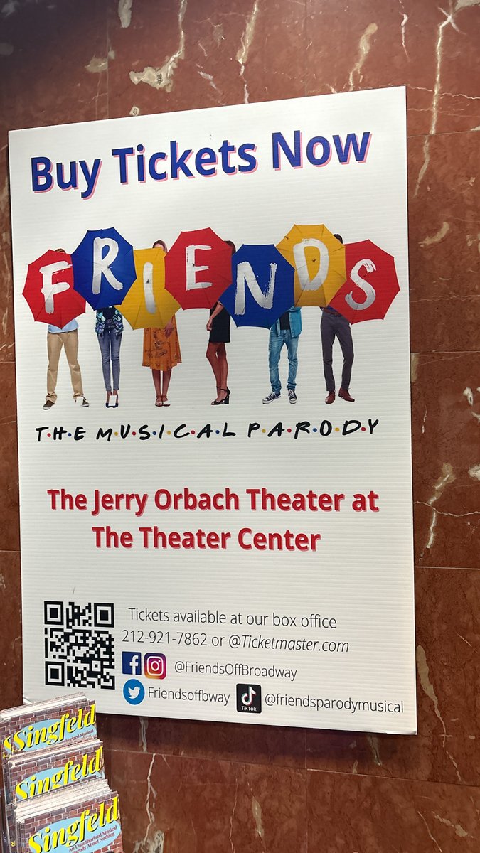 Off Broadway作品だが、海外ツアー経験もある様子。事前にレビューを読むと、「大絶賛」と「カネと時間の無駄」の真っ二つに割れていて、よっぽど面白いのか、よっぽど酷いのか…というのを確かめたい好奇心と、私自身「フレンズ」の大ファンだというのもあり観劇。ただ、「フレンズ」ハマったのはもう20年前の事なので、時間の許す限り…Season 1から7くらいまでを日本で復習してから観劇。