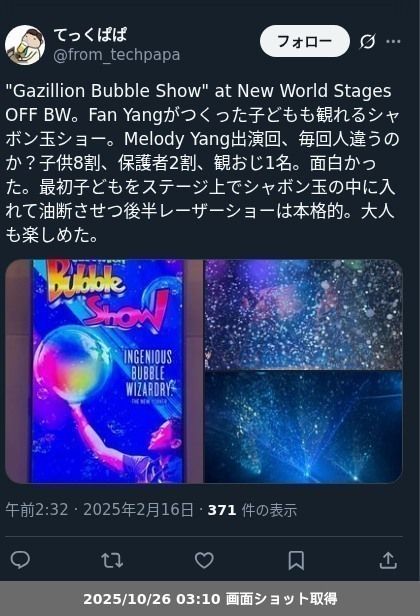 【ネタバレ分離】New World Stages 2「Gazillion Bubble Show」の観劇メモです。