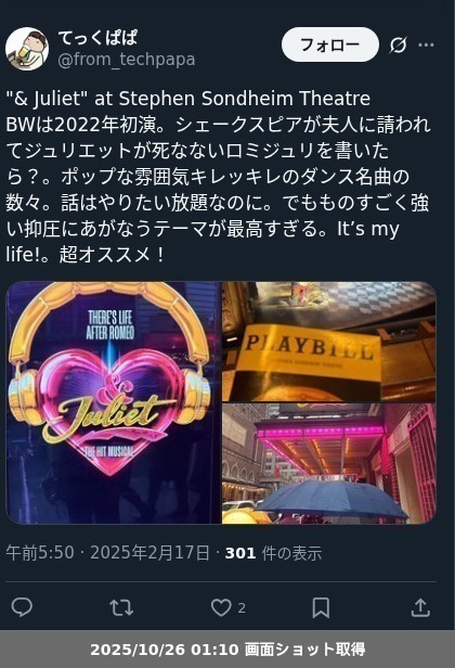 【ネタバレ分離】Stephen Sondheim Theatre「& Juliet」のレポートです。