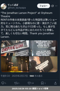 【ネタバレ分離】Orpheum Theatre「The Jonathan Larson Project」の観劇メモです。