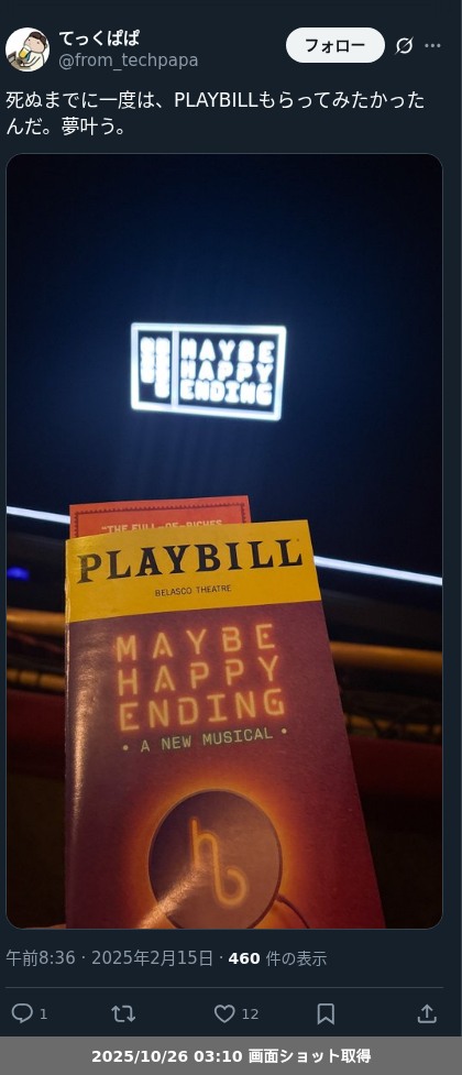 - On Broadwayで、2025年TONY賞のeligibilityのある最新の作品。日本でも放送される授賞式を見ながら、もし賞の候補に選ばれたらお酒を片手に「あーだこーだ」言いたい。(笑)