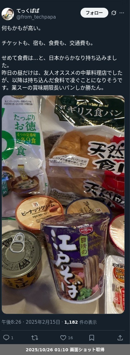 朝はジャムパン。昼は安いところで外食(飲み物は持参)。夜はカップラ。のパターンでコスト削減しておりました。