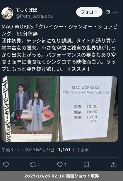 【ネタバレ分離】 MAO WORKS「クレイジー・ジャンキー・ショッピング」の観劇メモです。