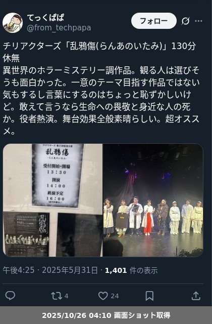 | 観劇日時 | 2025年05月31日 14時00分〜 |
