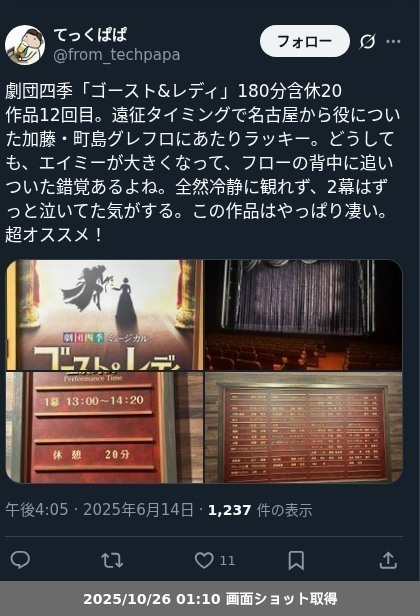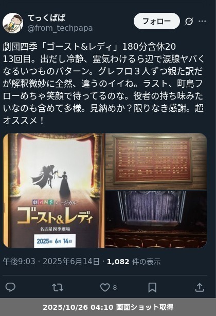 - 2024年11月08日 劇団四季 「ゴースト&レディ」(2024東京) ・・・「#劇団四季」のつづき