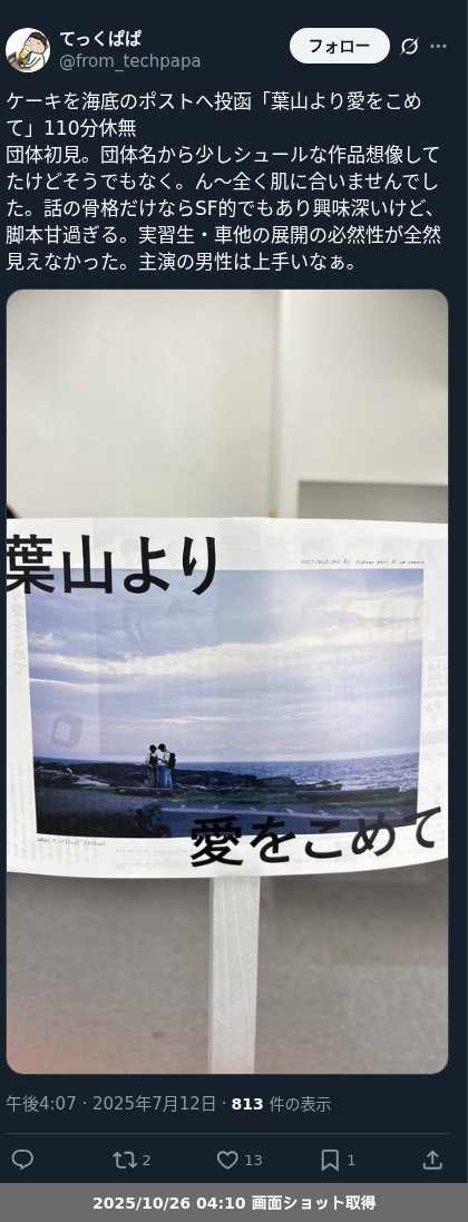 【ネタバレ分離】 ケーキを海底のポストへ投函「葉山より愛をこめて」の観劇メモです。