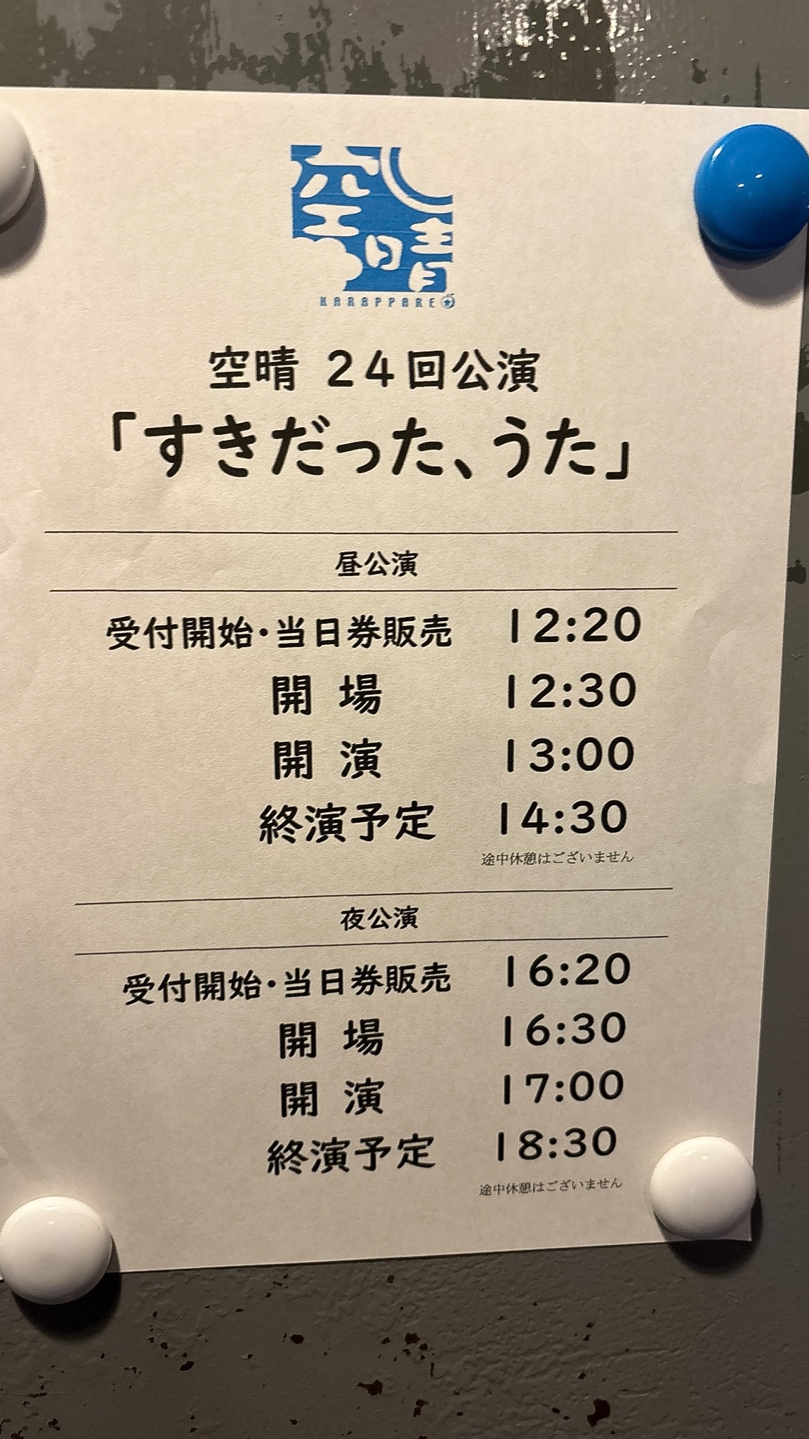 空晴版ミュージカル!?と銘打って、ミュージシャンでもあるクスミヒデオ(赤犬)さんを迎えた今回。頼れる浅野さん、はじめましての木内さん、そして劇団初のオーディションでまさかの先輩日詰さん!という心強いメンバーです。