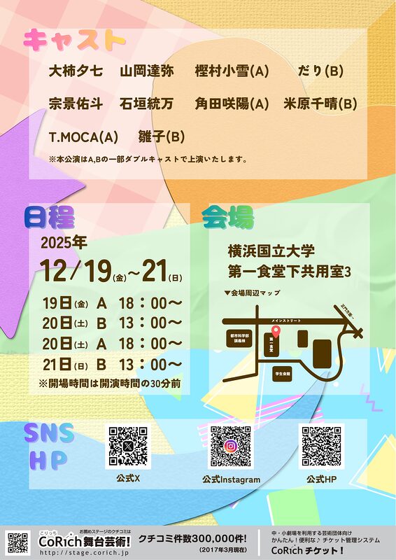 団体初見。第一回公演なので旗揚げかもしれない。横浜国大の劇団三日月座系の劇団だと思われる(まあ、公演場所からもそうだけれど)。不思議な感覚の作品で面白い。脚本家の筆力とセンスを感じる。物語、部屋が繋がってしまったのは何故なのか…というSF的な追及話は若干あるものの、七人は不思議とその状況を受け入れていて、その解決に大してそれ程熱心なわけでもない。その状況を受け止めた若い七人が、どんな人間模様を繰り広げるのか…という話がメイン。初対面の七人のぎこちない会話がとても納得感がり、また細かい笑いのネタなども多く、物語にぐいぐい引き込まれた。同じ部屋に集まってしまう設定は、なかなか失われない30年に似ている気もする。
