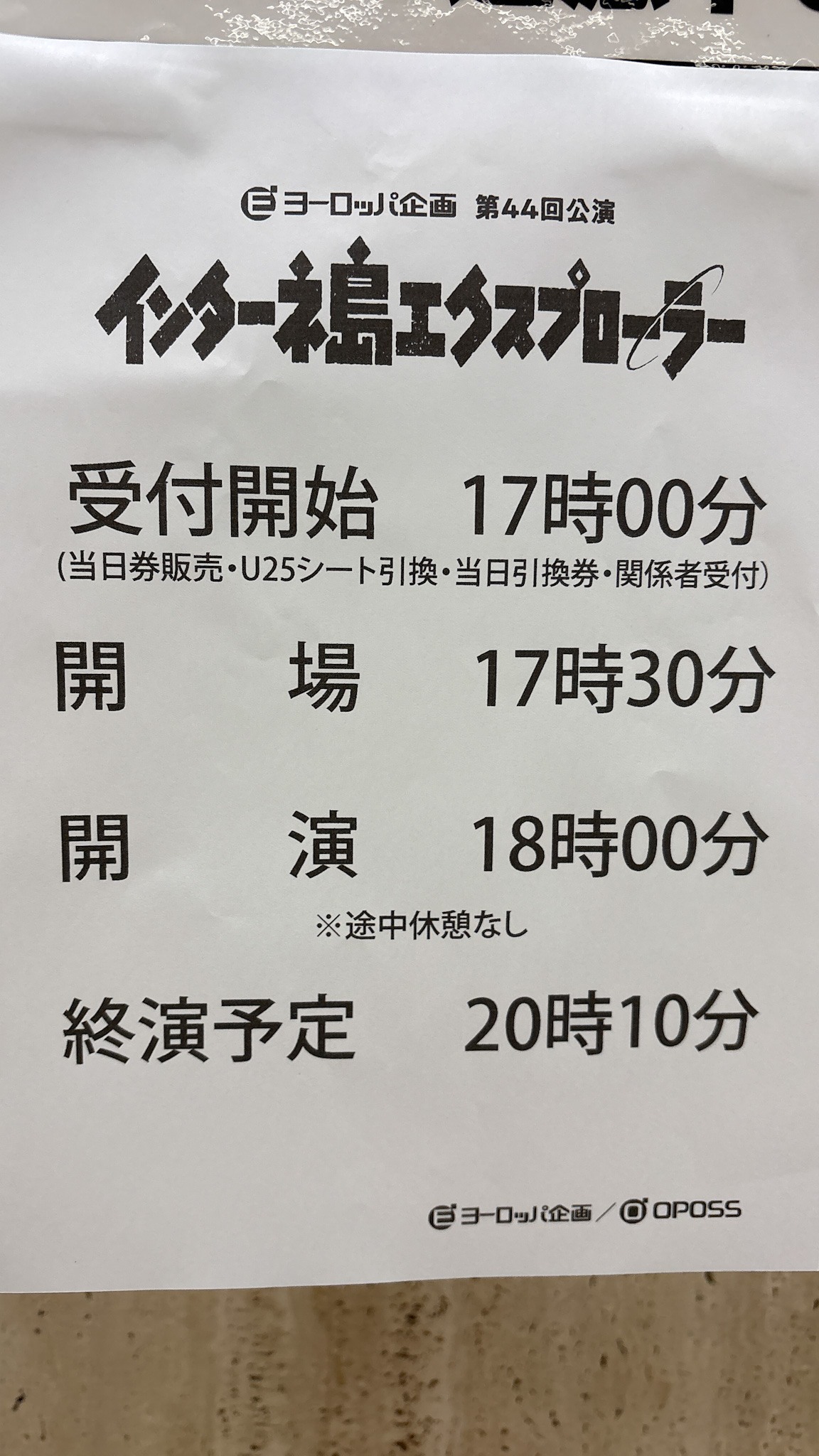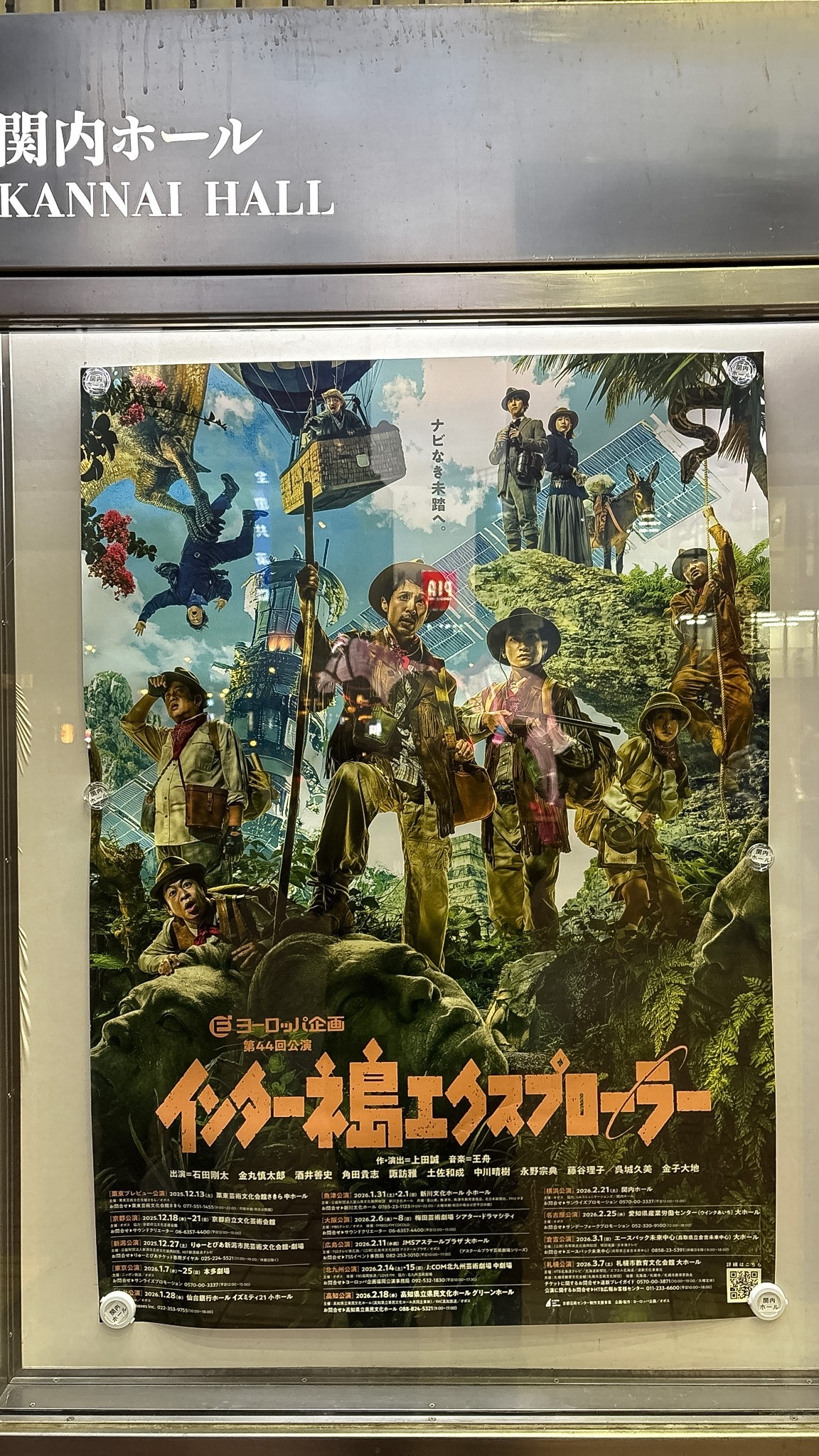 ヨーロッパ企画。団体初見。テレビ番組の冠にも見かけたりした劇団名。本公演も全国ツアーで規模がデカい。ここ数年毎回、私の地元の横浜関内ホールで一日だけの公演を打っている。…初見の団体を見るには東京公演でもいいのだが…やはり関内ホールで観たいなぁ…と機会を伺っていた。で、やっとみれたが…期待値を上げ過ぎたのか肩透かし。演劇を初めて観る時に「まず観るべき団体」に同劇団挙げる人もいるので、面白いんだろうなぁとかなり期待していたのが悪かったか。シチュエーションコメディだけれど…一体どこが面白いんだコレ…っていうのが正直な感覚。一か所だけクスリと笑った気がするが終演後に何処で笑ったか忘れてしまった。