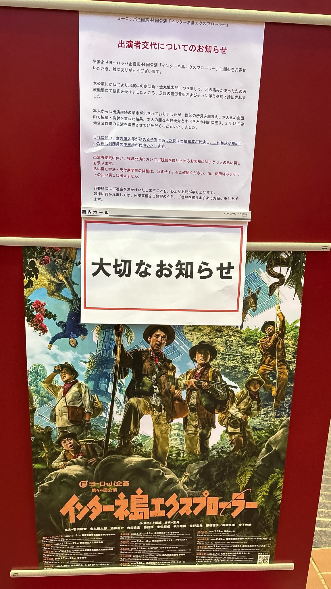 観劇直前に主役降板のお知らせ。理由は以下の通りで仕方がなく、むしろ公演を続行した事には好感を覚えるも。作品面白さの観点でいうと、主役の降板とは関係ないよなぁ…と思い。